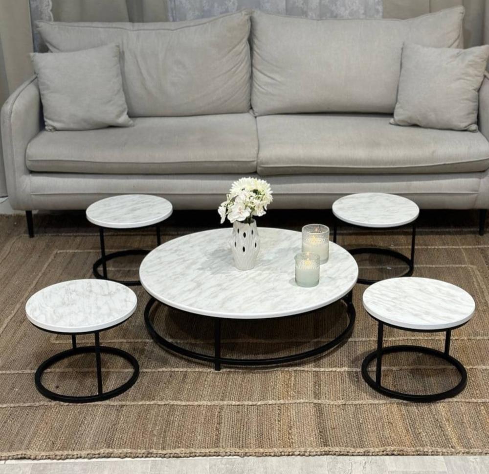 طقم طاولات أرضية 5 قطع بسطح خشب شكل رخام