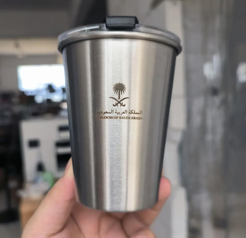 كوب من الفولاذ المقاوم للصدأ بحفر ليزر مُتقن بشكل شعار المملكة العربية السعودية 🇸🇦، يناسب المشروبات الباردة.
