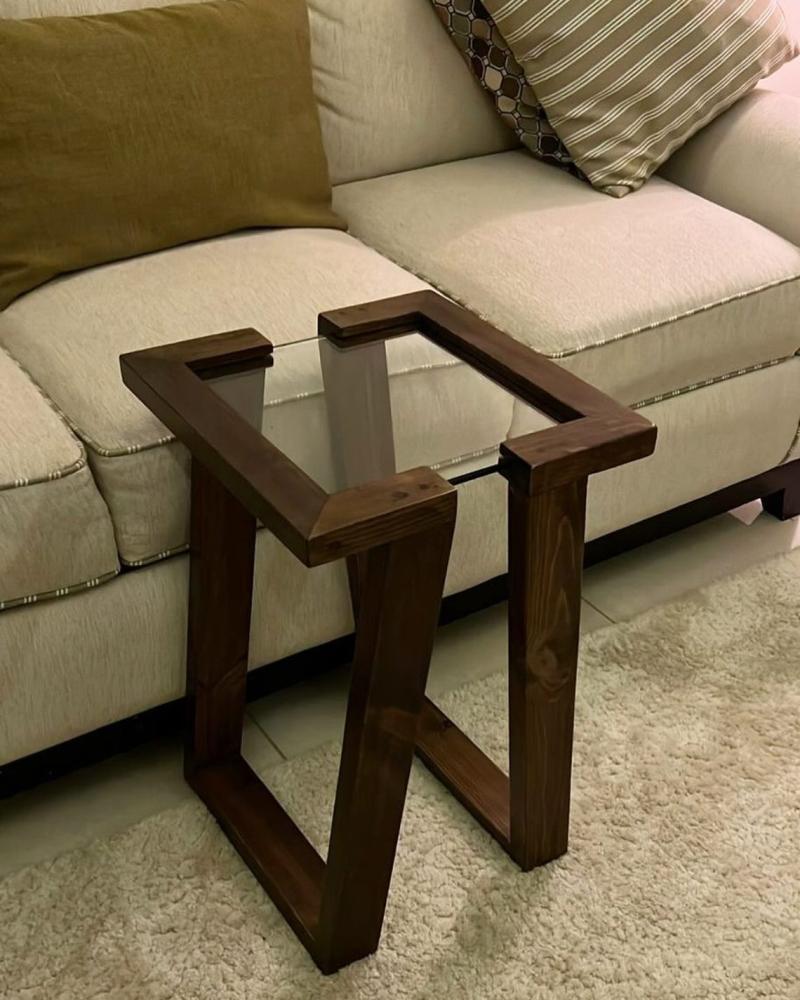 هذه طاولة خدمة مصنوعة من خشب السنديان ومزودة بسطح زجاجي، تتميز بتصميم حديث وعصري يجمع بين الصلابة والجمالية. يتكون الهيكل من إطار خشبي بتشطيب دقيق، حيث تم قطع الزوايا بشكل هندسي متقن ما يضفي لمسة فنية وأنيقة. الجزء العلوي من الطاولة هو لوح زجاجي شفاف مثبت بإحكام داخل الإطار الخشبي، مما يضفي عمقاً ويتيح رؤية التفاصيل الخشبية الجميلة من الأعلى. تتميز هذه الطاولة بالثبات والمتانة، وتعتبر إضافة مثالية لغرف الجلوس لتقديم المشروبات أو لوضع الكتب والأغراض الشخصية.